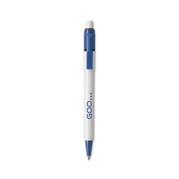 Bolígrafo de tinta azul. Cuerpo blanco y complementos de color. Carga R295. Opción escritura negro. STILOLINEA, Made in Italy. Material: Plástico ABS no tóxico. Medidas: Ø 10x134 mm.